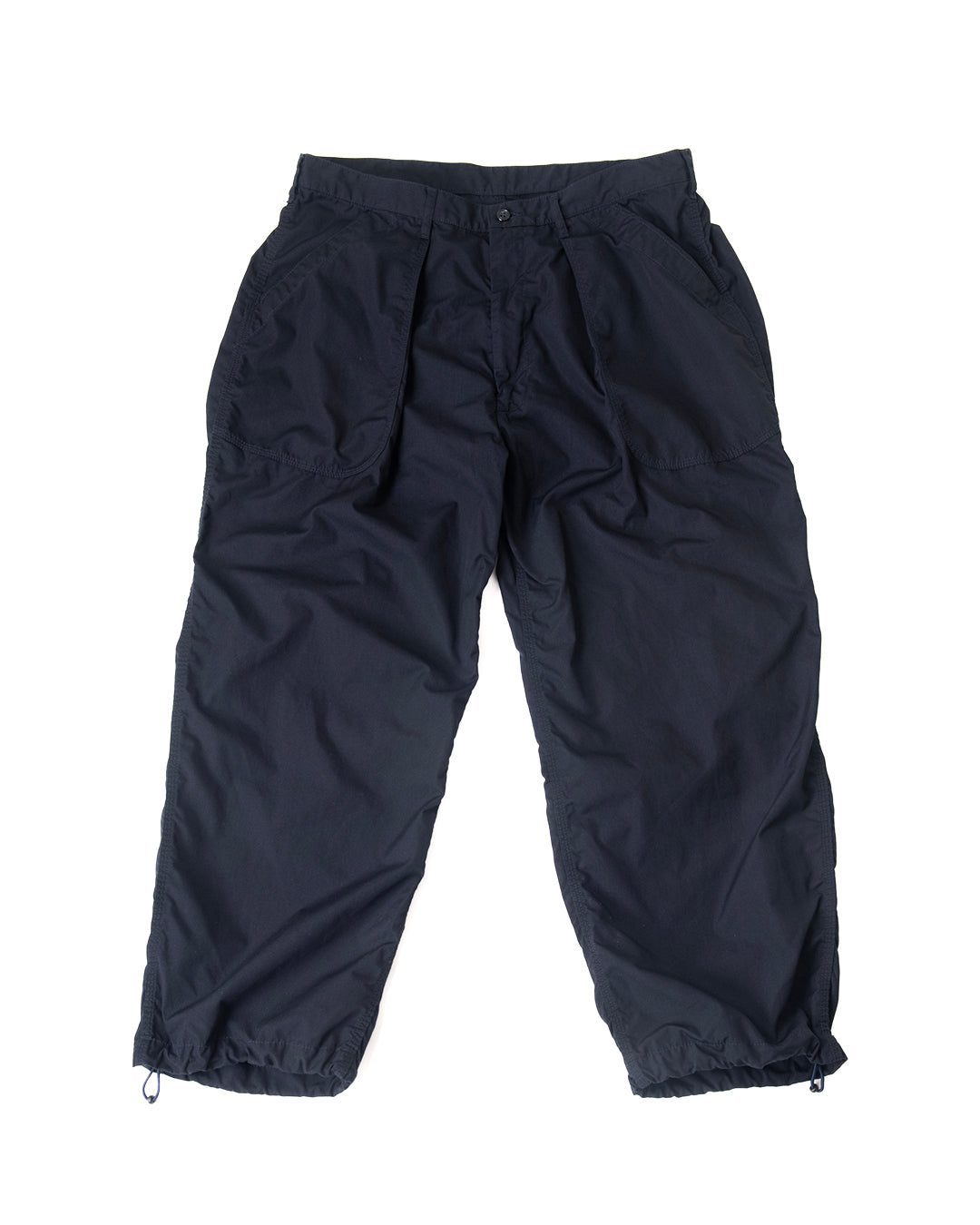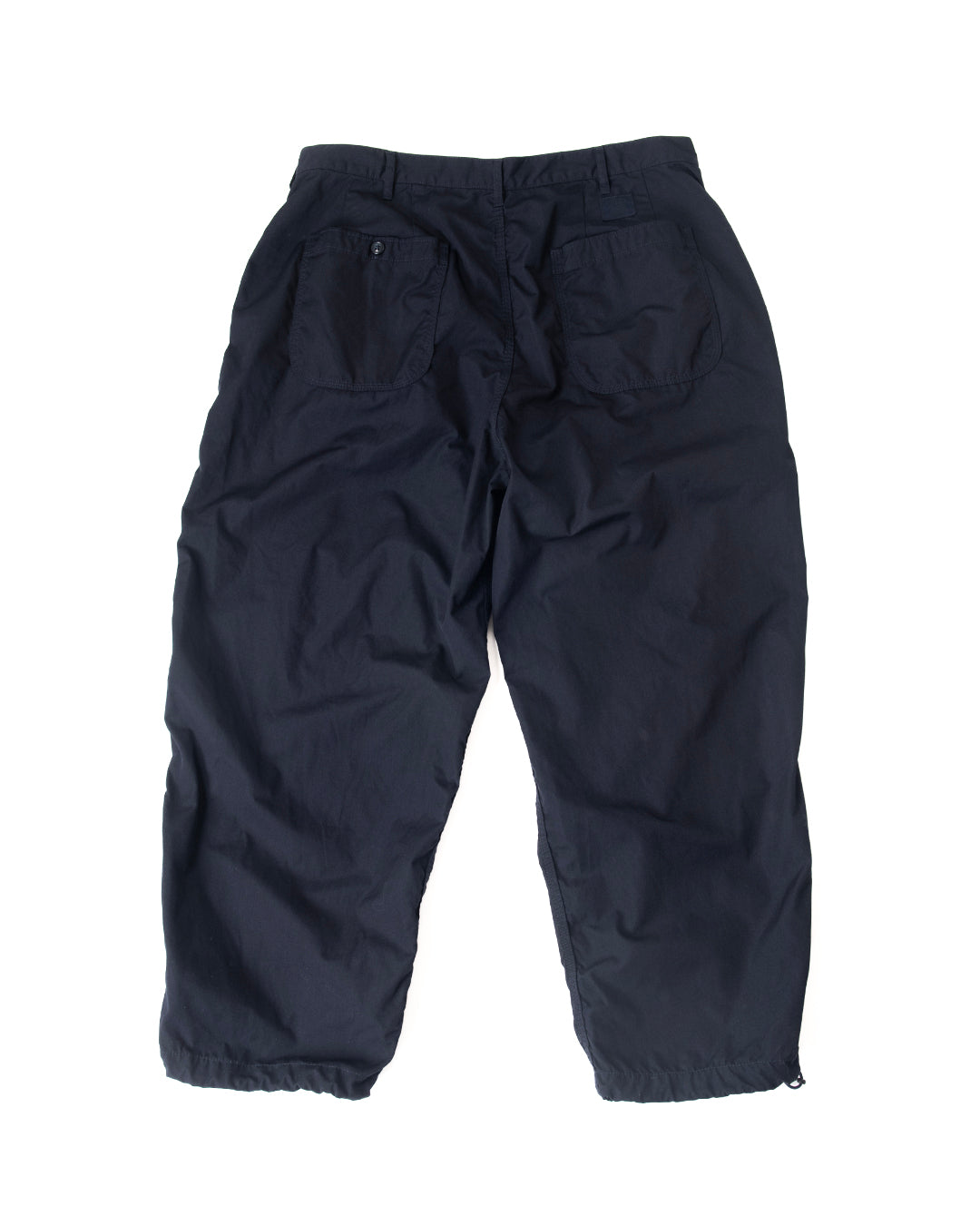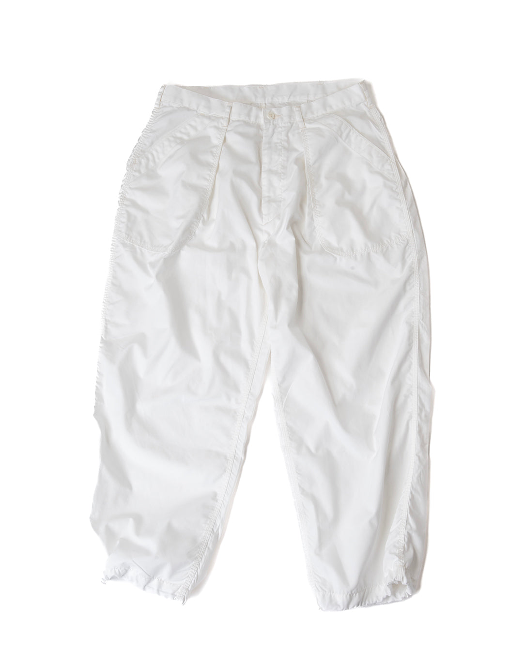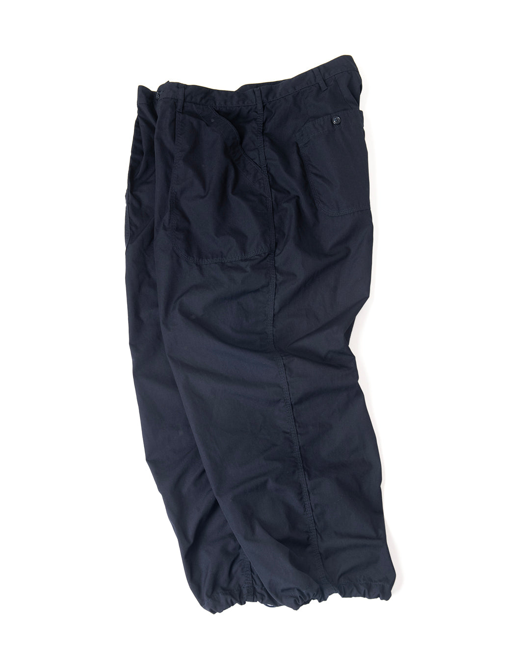 ”KANDA BIIKI”のウェザーシリーズの新作。以前扱っていたビッグサイズをカスタムしたデッドのUS NAVYのユーティリティーパンツをモディファイ。ラウンドしたフロントポケットのデザインはそのままに、各所をトリプルステッチで縫製。サイドやヒップは巻き縫いのトリプルステッチにより、パッカリングを生み出しています。ウエストにはプリーツがあり、ゆったりとしたシルエットです。裾は何かと便利なストリングを内蔵。ダークネイビーは製品染めにより、深い色合いを表現しています。