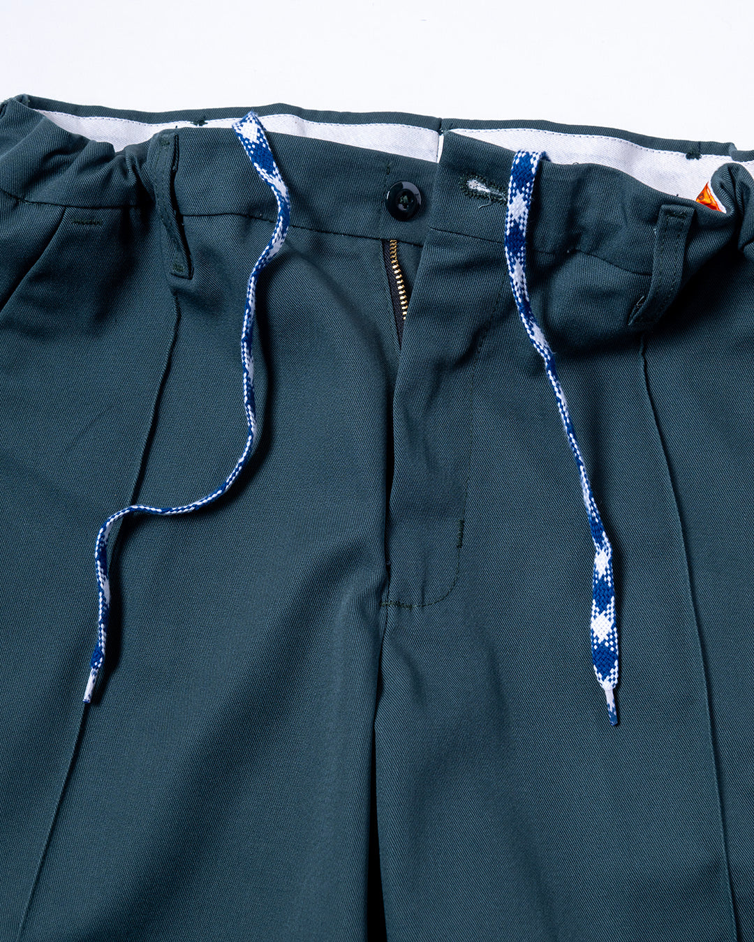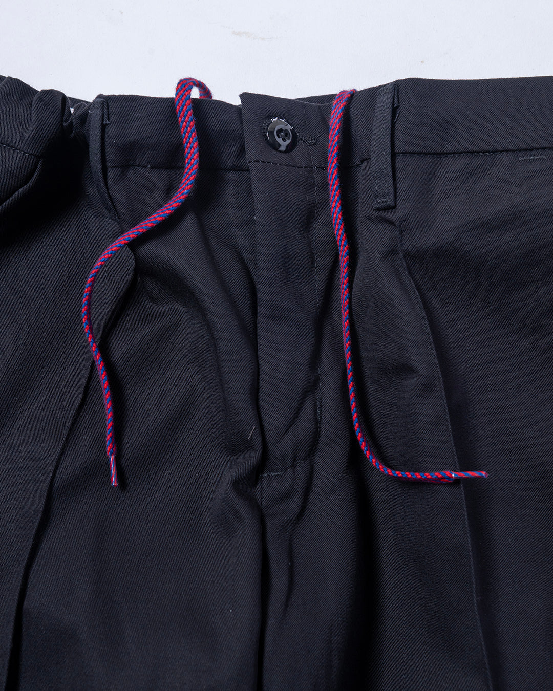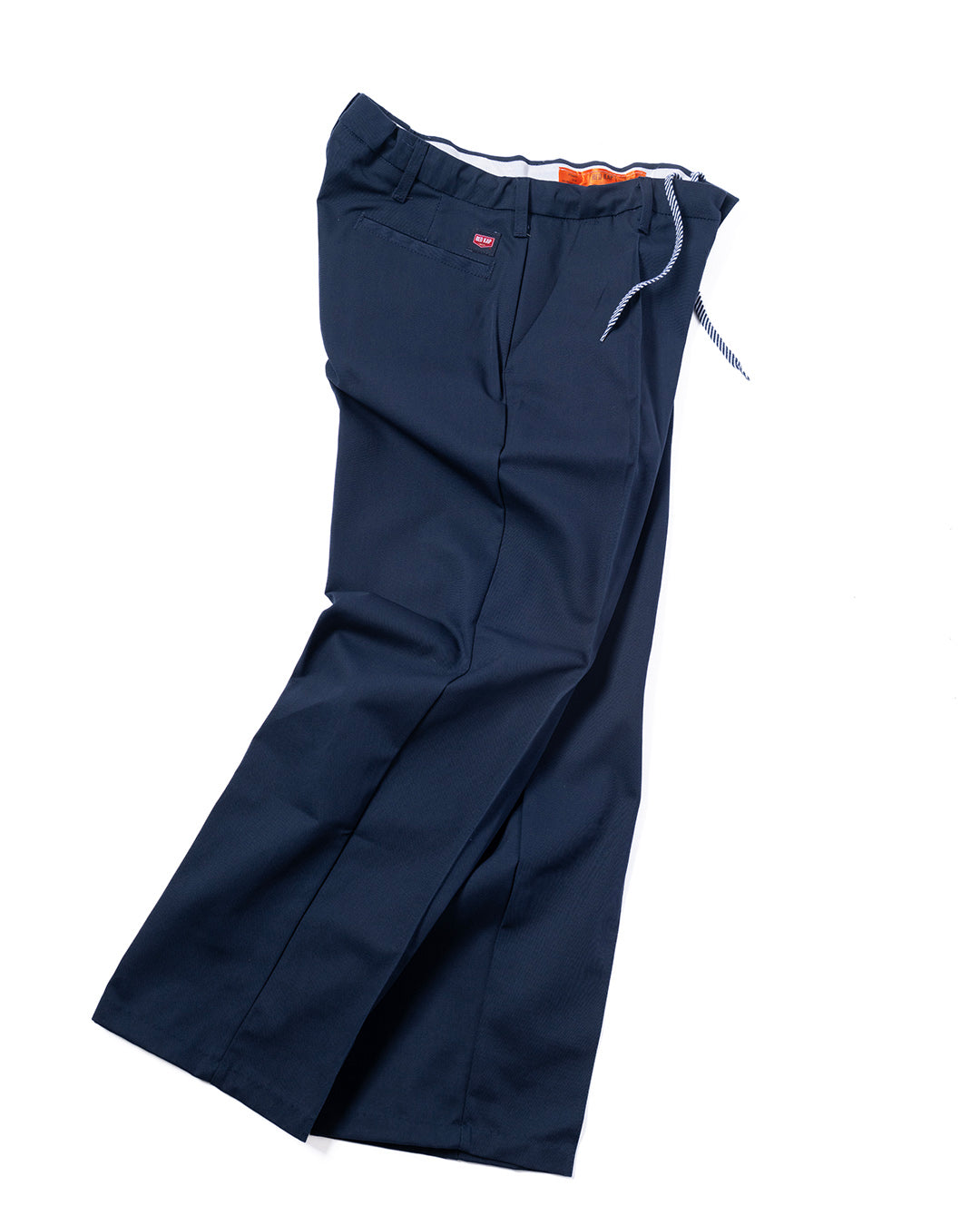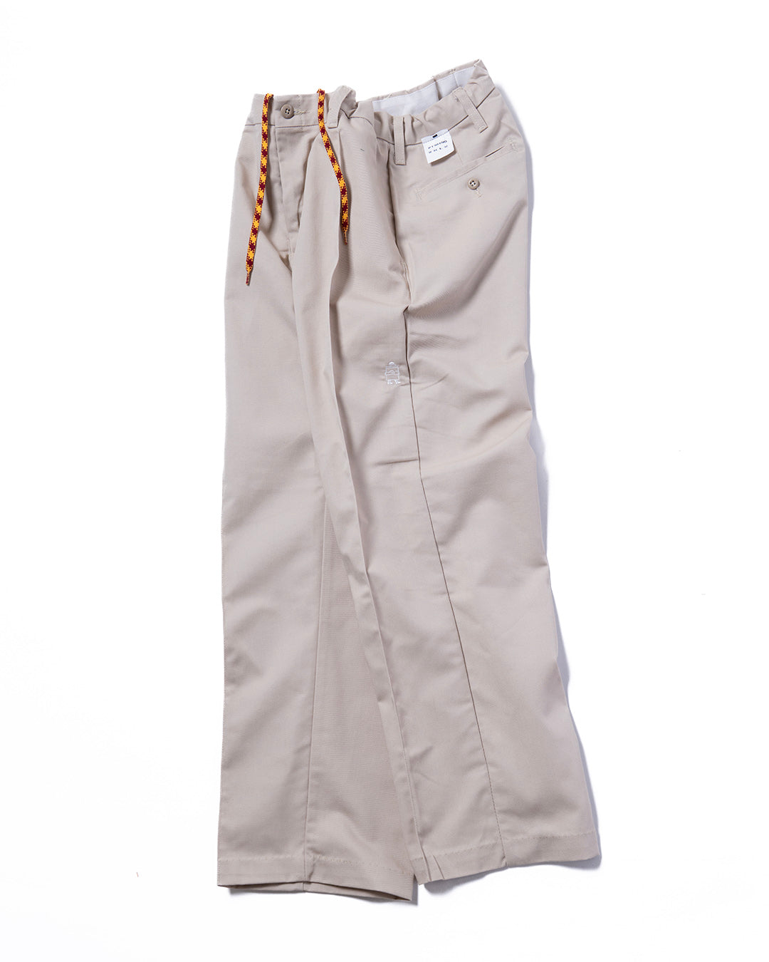 RED KAPのワークパンツをカスタマイズ。使用しているベースはPT10で、通常のワークパンツのようにザラザラと硬めな生地ではなく、柔らかくさらっとしておりスラックスのような雰囲気。フロントにはセンタープリーツを施し、ウエスト内側にストリングを内蔵していますので、ベルトレスで着用可能です。紐は”VINCENT SHOE LACE”にお願いしたものや、昔のデッドストック品を使用しています。