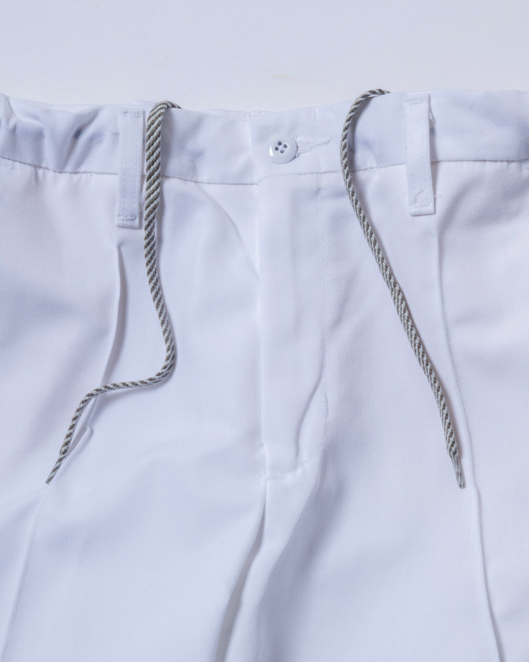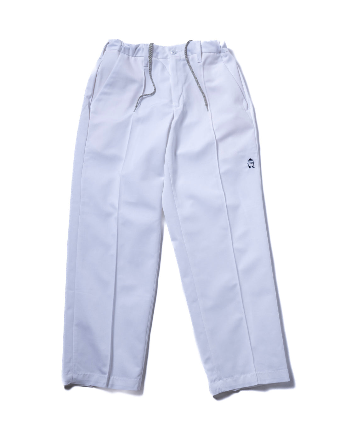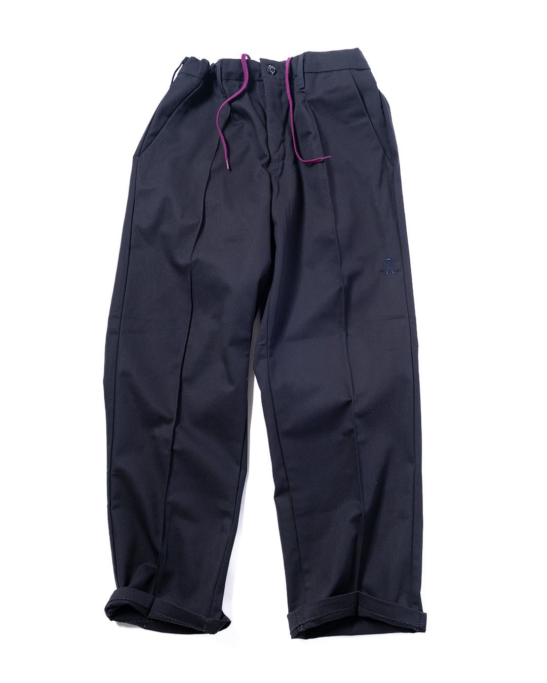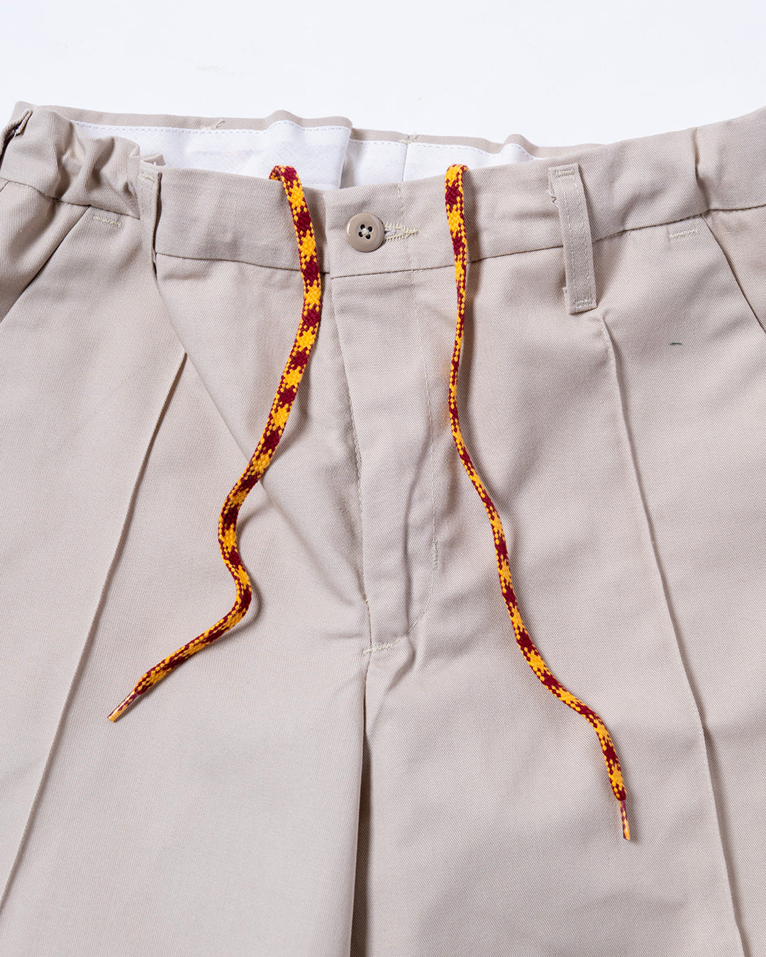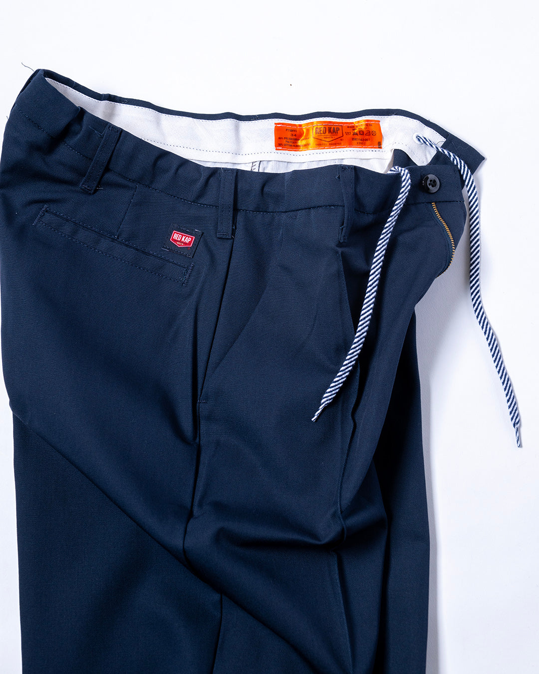 RED KAPのワークパンツをカスタマイズ。使用しているベースはPT10で、通常のワークパンツのようにザラザラと硬めな生地ではなく、柔らかくさらっとしておりスラックスのような雰囲気。フロントにはセンタープリーツを施し、ウエスト内側にストリングを内蔵していますので、ベルトレスで着用可能です。紐は”VINCENT SHOE LACE”にお願いしたものや、昔のデッドストック品を使用しています。